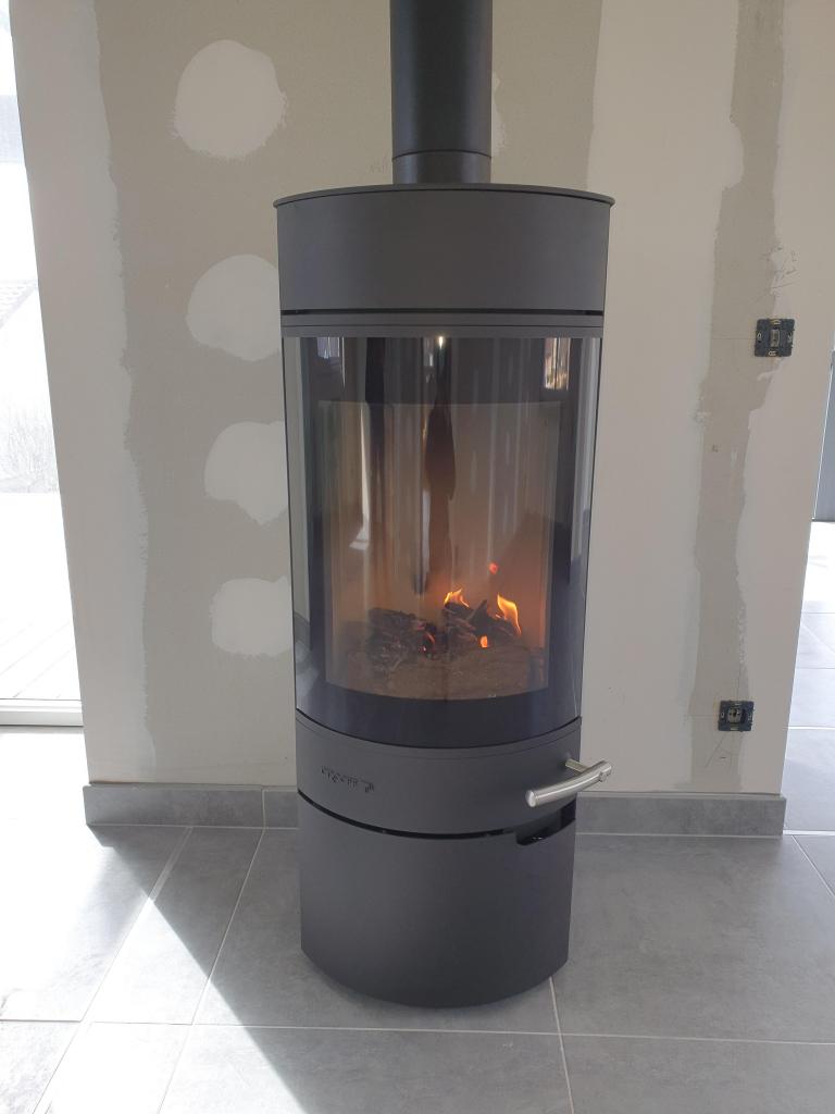 Du fait de la configuration de la pièce, nous lui avons proposé l'installation de ce poêle à bûches Andalo 2 de la marque Droof car il propose la possibilité de rotation (rotation de 120°) qui permet d'orienter le foyer vers la zone de la pièce souhaitée.
