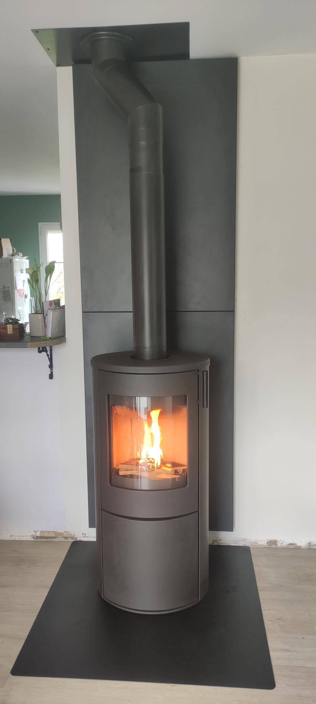 Installation d'un poêle à bois-bûches, de la marque RHEA dans la ville de La Châtre-Langlin, en Indre (36).